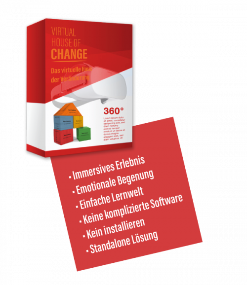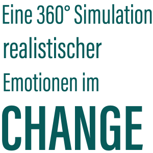 Der Einsatz des virtual House of Change in Workshops, Trainings und Coachings ermöglicht eine wesentlich tiefere Auseinandersetzung mit den Emotionen die im Kontext eines Veränderungsprozesses auftreten. In der 360°-Anwendung können sich Führungskräfte und Mitarbeiter gleichermaßen auf die Anforderungen an sich selbst und an andere vorbereiten, dieses Erleben reflektieren und vor allem die Emotionen sprachfähig machen. Aus unserer Erfahrung sind das elementare Voraussetzungen dafür, in Veränderungsprozessen wirksam zu sein.